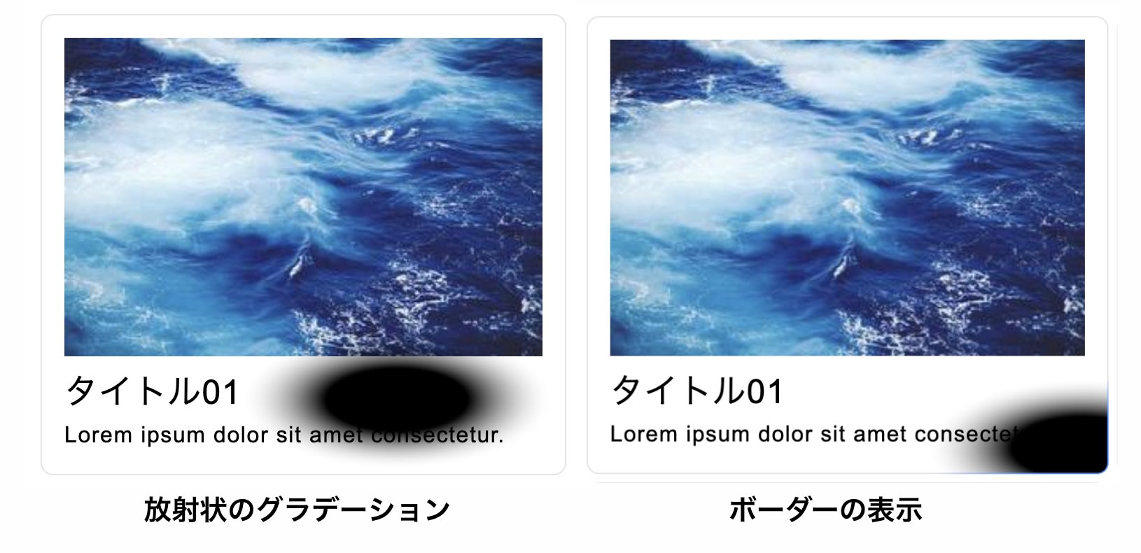 mask-imageでこのグラデーションマスクを指定することで、黒い部分のみ表示されることで、マウスの位置がボーダー付近にある場合のみ、ボーダーが表示されるようになります。